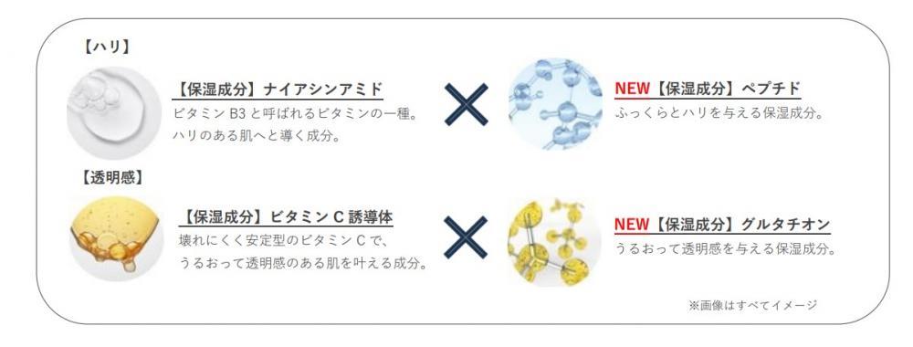 既存のシリーズに配合された保湿成分(ナイアシンアミド、アスコルビルグルコシド)に加え、新たに「パルミトイルトリペプチド-38(保湿)」、「グルタチオン(保湿)」を配合することでハリと透明感の両方を集中的にケアできる処方を実現しました。