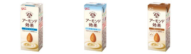 1つめの対象商品は、グリコ「アーモンド効果」「アーモンド効果 砂糖不使用」「アーモンド効果 3種のナッツ」(各200ml)。