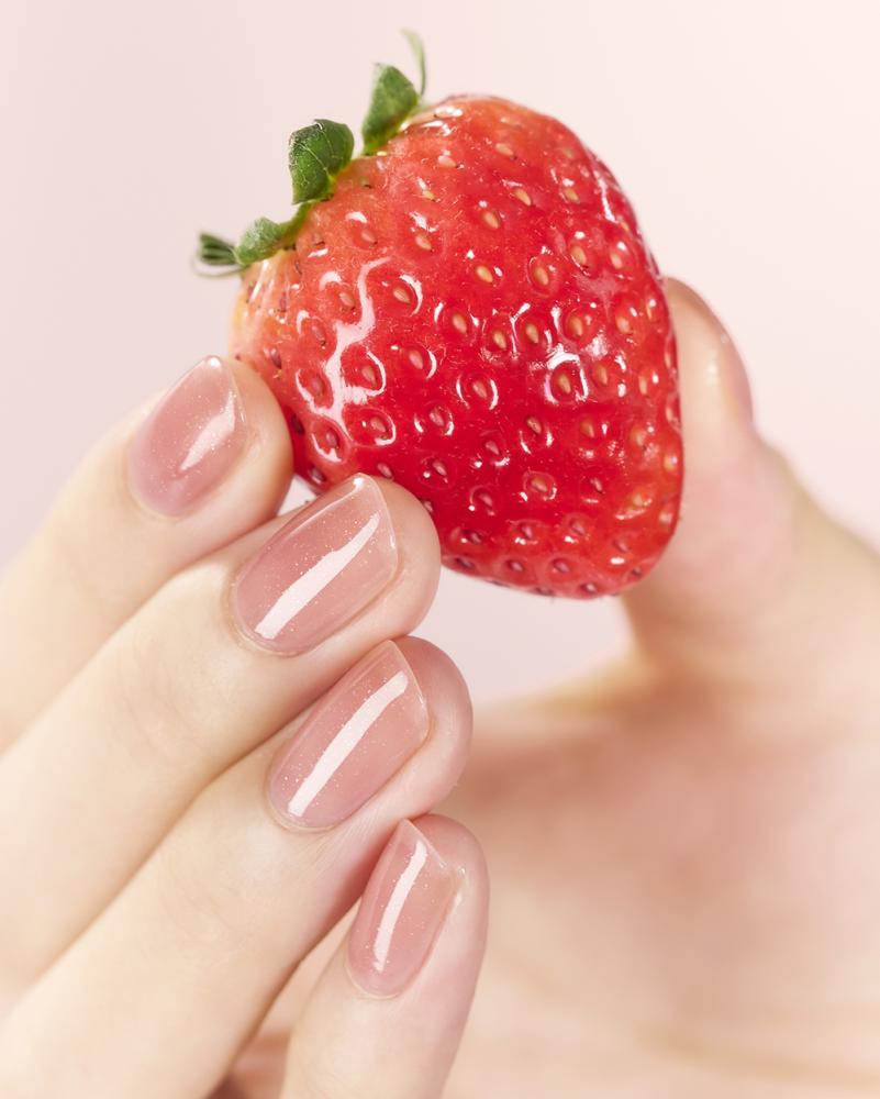 今回登場する新色は、朝摘みいちごをイメージした、粒ラメ入りの赤みピンク。ジューシーな血色感とぷるんとしたみずみずしさを感じさせる指先に仕上がります。また、とろみのあるクリアな液が、爪を厚めにコートすることでみずみずしいツヤと透明感を演出。さらに、みずみずしいいちごの甘酸っぱさが漂うような、スイート&フルーティな香りを楽しむことができます。