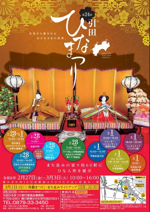 2026年2月27日から3月3日まで、JR引田駅前よりひけた古い町並み一帯(東かがわ市)にて「引田(ひけた)ひなまつり」が開催されています。古い街並みとおひなさま かつて引田では女児が誕生すると、初節句に「引田飾り」と呼ばれる飾りつけを、親族や近所に披露する風習がありました。この風習を現代によみがえらせたお祭りです。引田の古い町並みの約60軒に、江戸時代のものから現代のものまで、さまざまなおひなさまが飾られます。地元園児が作ったかわいらしい手作りおひなさまの展示もあります。ほかにも、お琴教室の発表会や甲冑武者行列、子ども歌舞伎など、お祭り気分を盛り上げるイベントが盛りだくさんです。 入場無料。開催時間はイベントによって異なるので、詳細は公式サイトを確認してください。