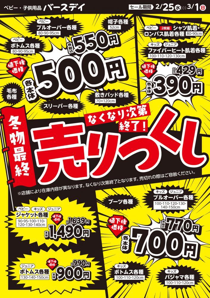 しまむらグループのベビー・トドラー用品の専門店「バースデイ」は、2026年2月25日から3月1日まで「冬物最終うりつくし」セールを開催しています(宮崎県・鹿児島県・沖縄県は除く)。