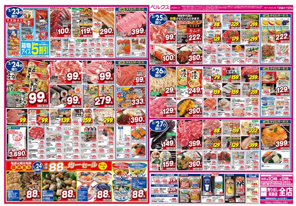 日替わりセールが多く、火曜は「88円均一セール」、土曜は「冷凍食品(弁当材料・パスタ・米飯)セール」など、曜日ごとのセールもあります。また16時からのタイムセールもあるので、夕飯前の買い出しもお得です。