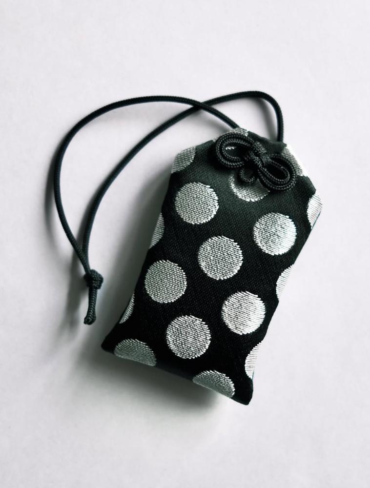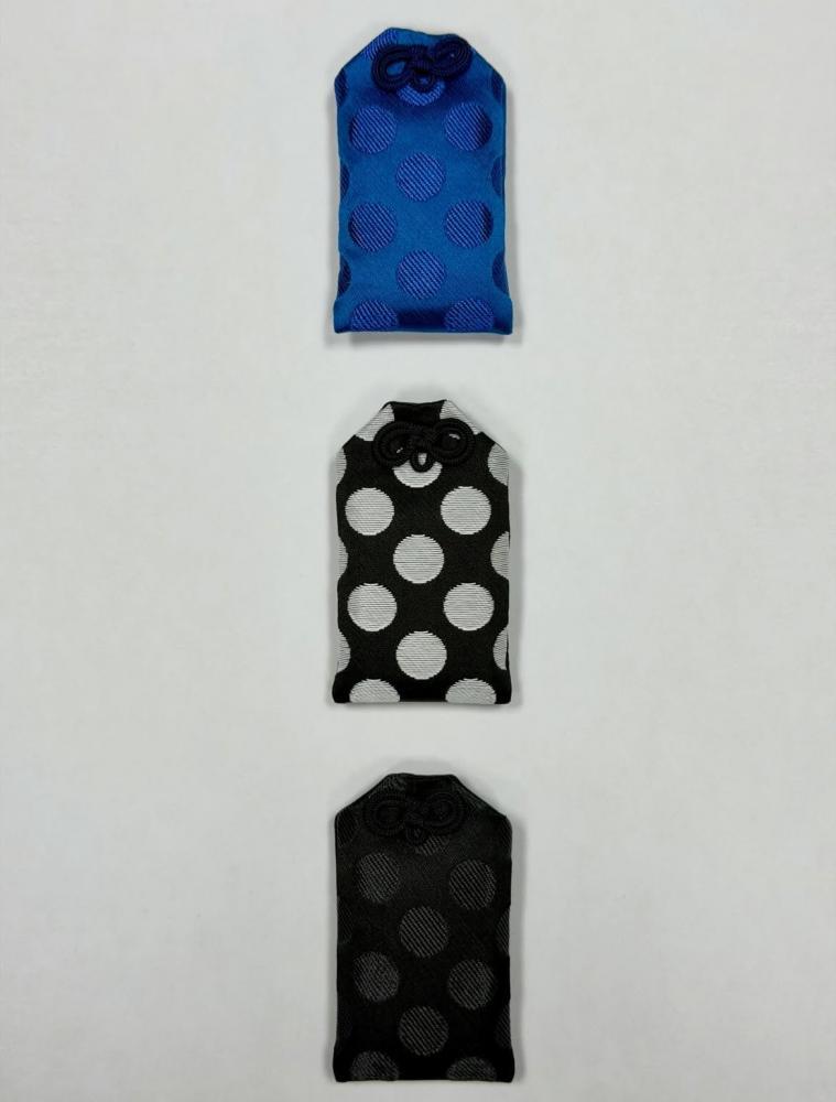 成田山圓能寺で授与している「ドット柄身代わりお守り」の特長は、大きなドット柄と、黒や銀などのモノトーンなカラーを組み合わせた斬新なデザイン。