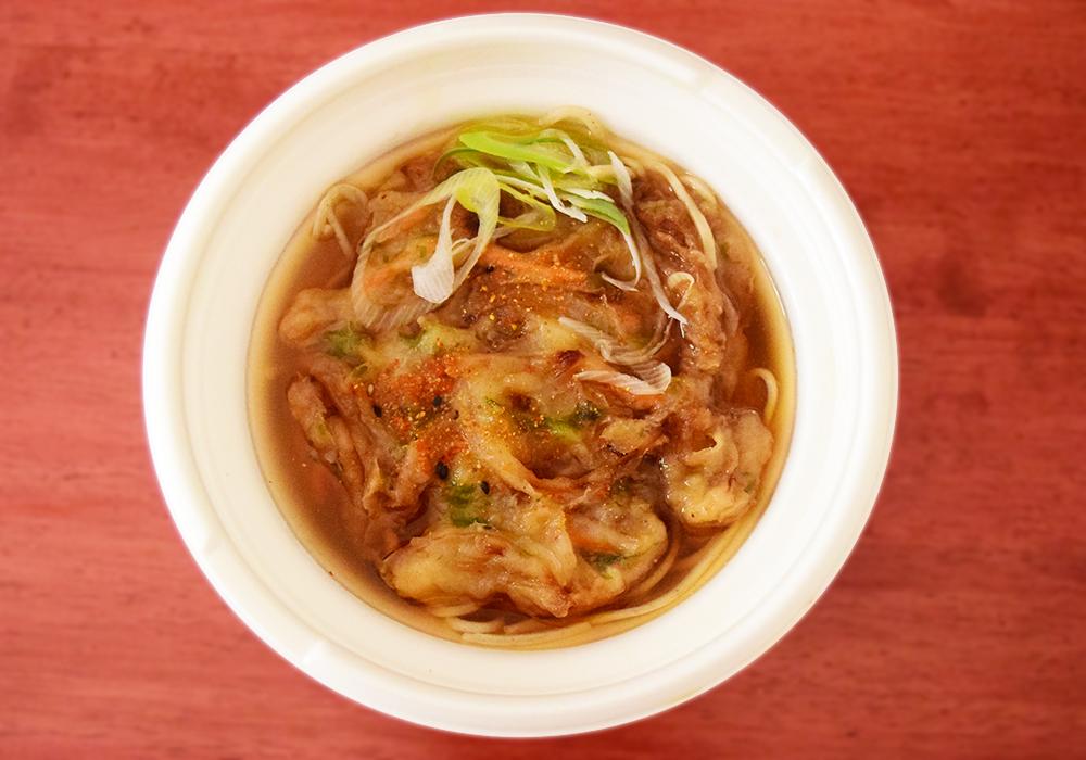 鰹の香りがふわっと立ち上ります。かき揚げは容器全体に広がっており、くしゅっとした見た目です。