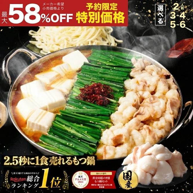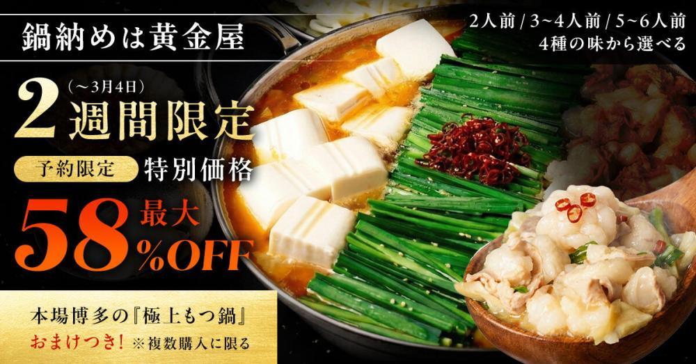 そのひとつは、博多もつ鍋の「黄金屋」の「極とろもつ鍋セット」(2人前~)です。26年3月4日19時59分まで、"最大58%オフ"の予約限定セールを実施しています。