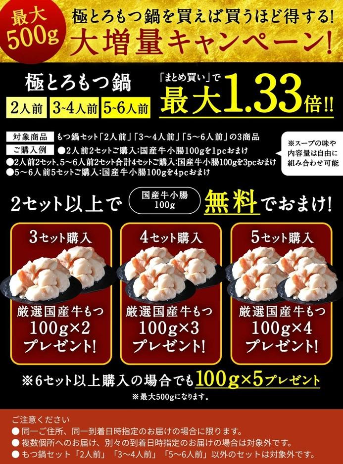 今ならさらにお得なキャンペーンが実施中です。2セット以上購入で、「国産牛小腸100g」が無料でもらえます。