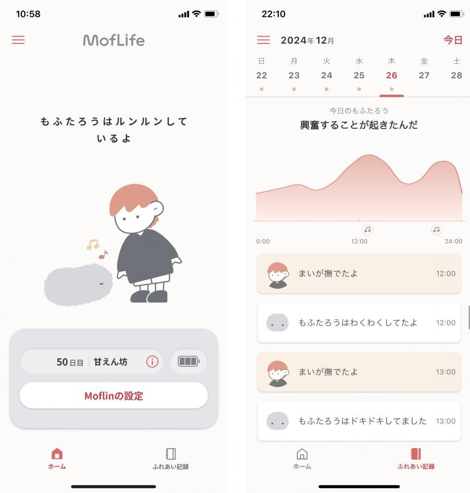 また、専用アプリ「MofLife(モフライフ)」により、モフリンの現在の感情をアニメーションで視覚的に確認したり、気持ちの変化をグラフやメッセージで把握できます。