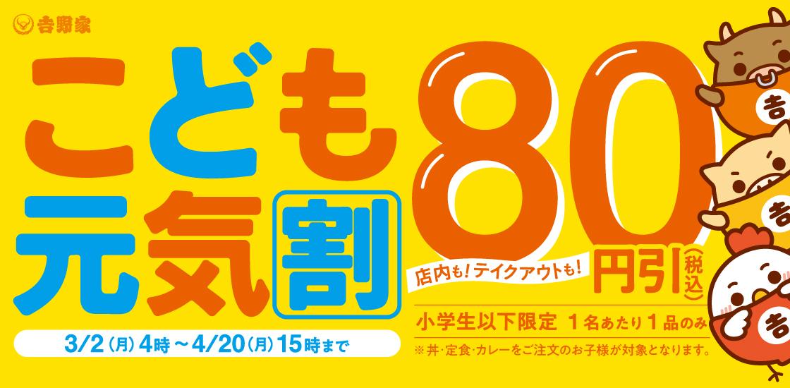 春休みから新学期にかけての期間に合わせて、小学生以下(小学生を含む)の子どもを対象に、丼や皿、定食、カレー、お子様メニューが80円引きでお得に楽しめるキャンペーンを、4月20日15時まで実施しています(一部店舗を除く)。