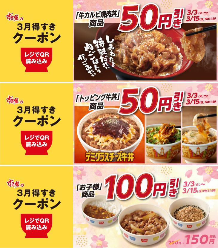 すき家は、2026年3月3日から15日まで、公式アプリと公式Xで「3月得すきクーポン」を配信しています。