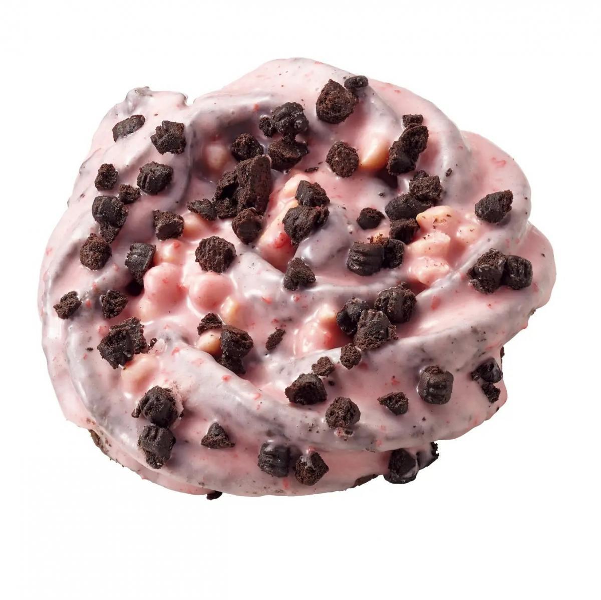 いちごチョコでコーティングしたクッキードーナツ。北海道牛乳使用の生地とバタービスケットやココアビスケットのザクザク感が相性抜群です。