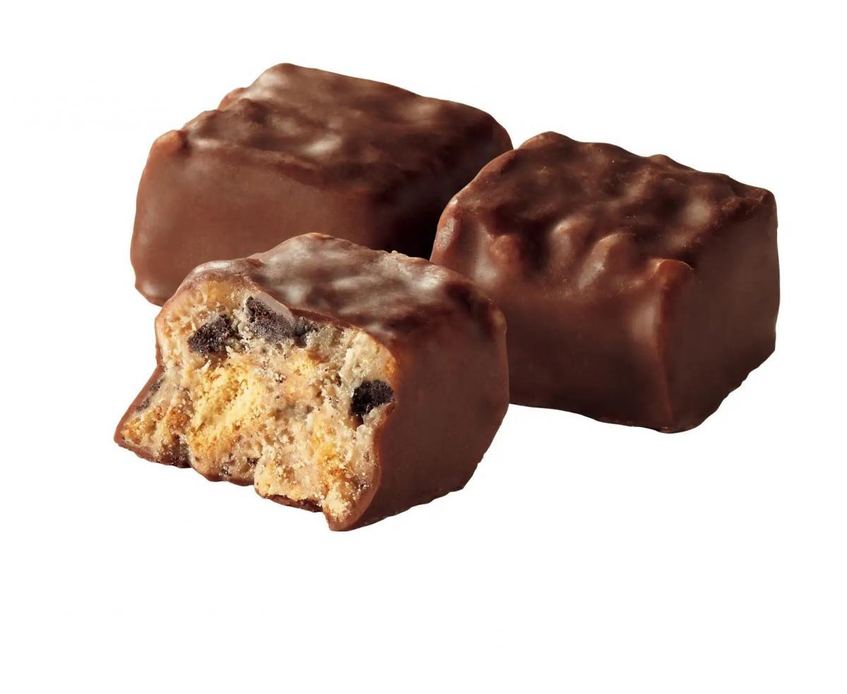 チョコアイスに2種類のクッキーを混ぜ込み、ザクザク感を再現したモナカアイス。