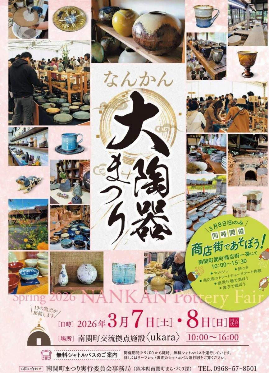 2026年3月7日と8日、南関町交流拠点施設<ukara>特設会場一帯(玉名郡南関町関町1230)にて「なんかん大陶器まつり」が開催されます。福袋販売やろくろ、手びねり体験などイベント満載 南関町の春の風物詩、「なんかん大陶器まつり」が今年も開催。特設会場に19の窯元が集結し、個性豊かな作品が展示販売されます。福袋販売をはじめ、ろくろ・手びねり体験、ステージイベント、高校生による作品販売など、楽しいイベントが目白押し。1万円相当の陶器が当たる大抽選会も開催されます。お気に入りの焼き物を新生活に取り入れて、心豊かに暮らしてみませんか? なお8日には、会場近くの南関町関町商店街一帯でマルシェや餅つきもイベント「商店街であそぼう!」も同時開催されます。 入場無料。開催時間は10時から16時までです。
