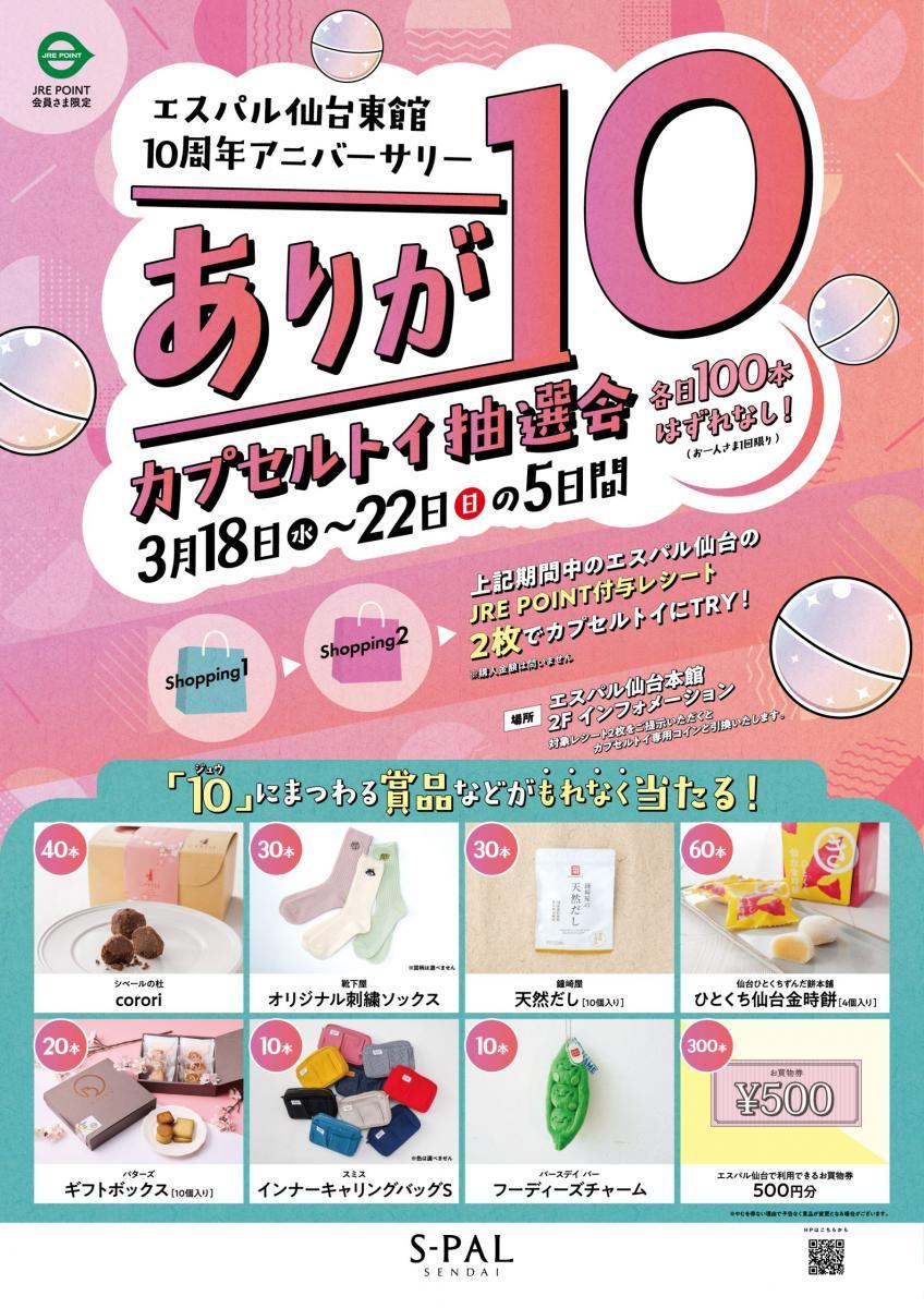 2026年3月18日から22日まで、エスパル仙台(仙台市青葉区)2Fインフォメーションにて「エスパル仙台東館10周年アニバーサリー『ありが10カプセルトイ抽選会』」が開催されます。オリジナル刺繍ソックスやお買い物券が当たる エスパル仙台東館10周年アニバーサリーを記念して、「ありが10カプセルトイ抽選会」が開催されます。JRE POINT会員対象で、期間中に館内2ショップ以上で買い回りしたレシートを持っていくと、各日先着100人に500円お買物券もしくは【ジュウ】にまつわるアイテム(オリジナル刺繍ソックス、500円お買い物券、天然だしなど)が当たります。ハズレなしのお得なカプセルトイなので、この機会にショッピングを楽しんで。 開催時間は10時から20時(金土祝前日は21時)までです。
