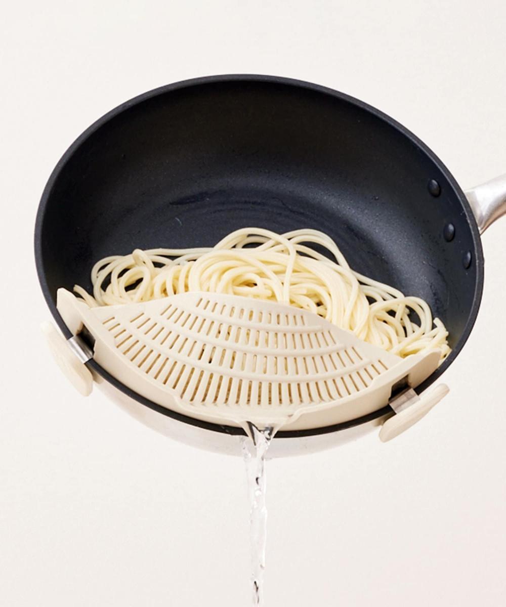 クリップ式で鍋やボウルに取り付けられるシリコーンザル。水切りや湯切りが簡単にできるキッチン便利グッズです。スリット状の穴なので、お米とぎにも使えます。ザルのために別の道具を使い分ける必要がありません。