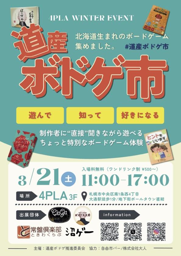 2026年3月21日、4PLA(札幌市中央区南1条西4丁目)3階「自由市バー」横にて「道産ボドゲ市」が開催されます。