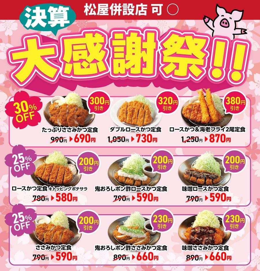 とんかつ専門店「松のや」のお得なキャンペーン「決算大感謝祭!!」が、2026年3月19日15時で終了します。16日に松のやの公式Xアカウント(@matsu_noya)が発表しました。