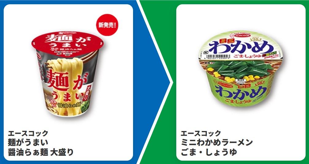 5つめの対象商品は、エースコック「麺がうまい 醤油らぁ麺 大盛り」。1個購入すると、「ミニわかめラーメン ごま・しょうゆ」1個と引き換えられる無料券がもらえます。