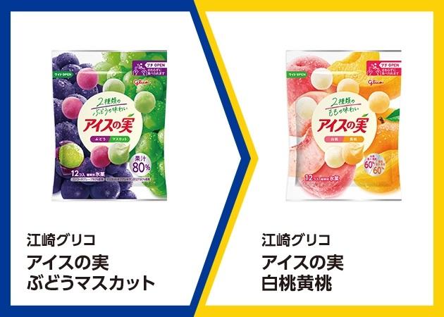 1つめの対象商品は、江崎グリコ「アイスの実 ぶどうマスカット」です。1個購入すると、「アイスの実 白桃黄桃」1個と引き換えられる無料券がもらえます。