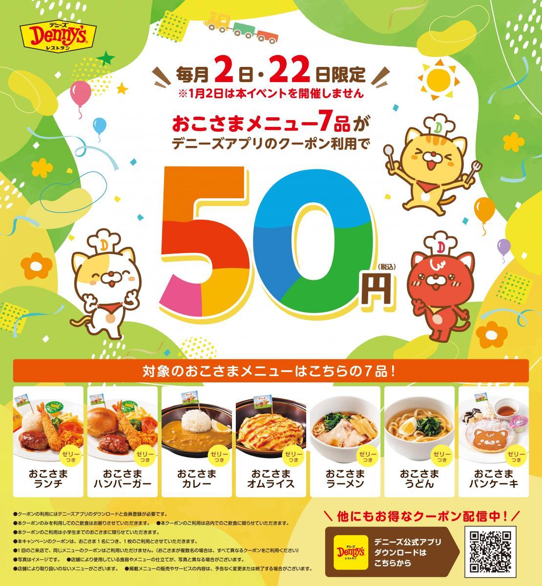 デニーズは、毎月2日と22日限定で対象のおこさまメニューが50円になるクーポンを公式アプリで配信しています。