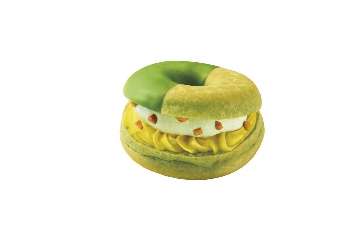 祇園辻利の宇治抹茶を練り込んだふわむち食感のドーナツ生地を宇治抹茶チョコでコーティング。栗あんと宇治抹茶ホイップに、カリっとした食感がアクセントになるキャンディングアーモンドをトッピング。