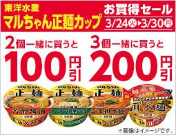 【対象のカップ麺を2個同時購入で100円引、3個同時購入で200円引】