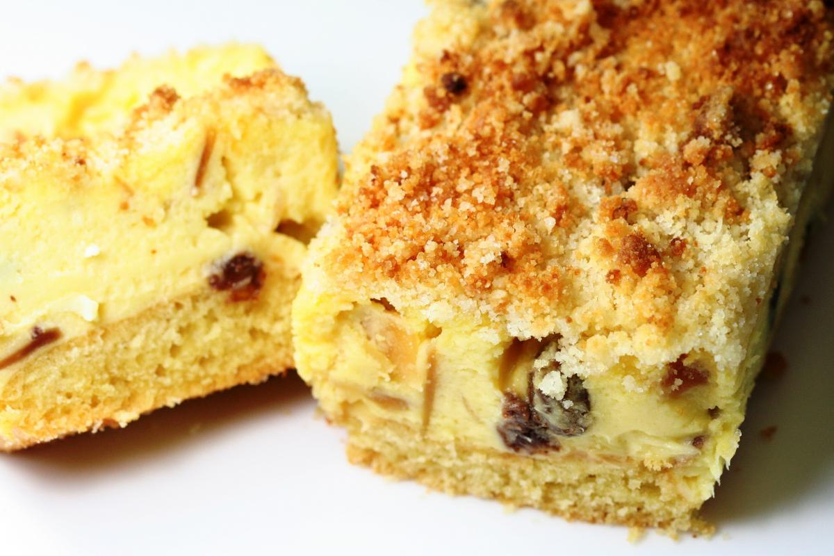濃厚な味わいを生み出す3層構造が特徴。きび糖を使用した素朴でナチュラルな甘さのスポンジ生地、クリームチーズをベースにスライスアーモンドとレーズンを加えたチーズケーキ生地、そしてアーモンドプードルで作ったサクサクのシュトロイゼルを表面にのせています。