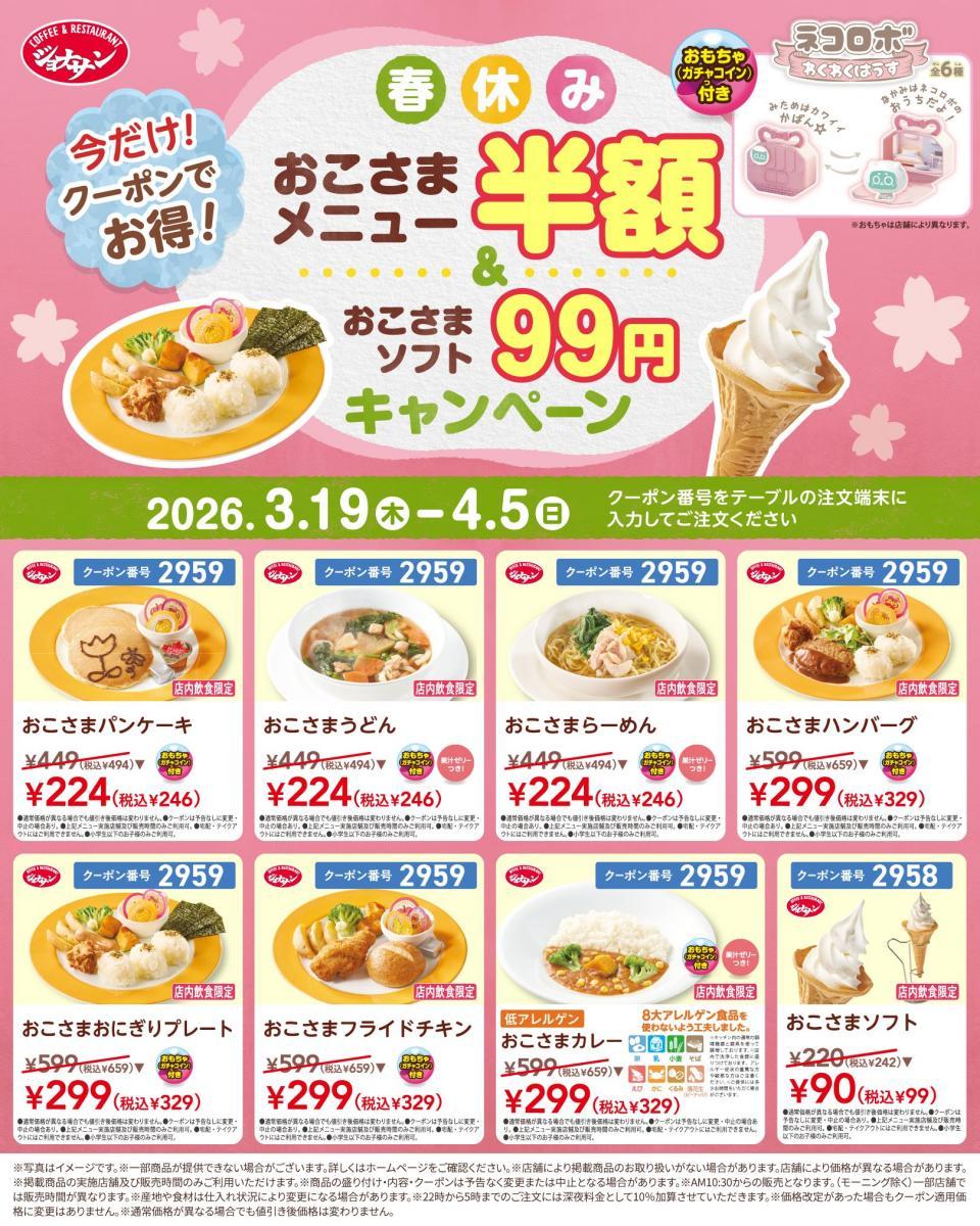 また、通常242円の「おこさまソフト」は半額以下の99円に。上記のおこさまメニューと一緒に注文しても、345円~428円とお手頃です。春休みの外食に活用してくださいね。