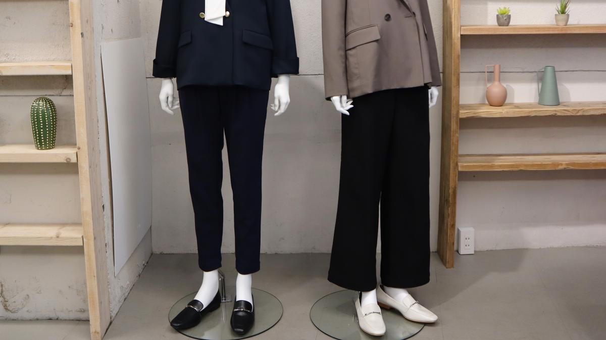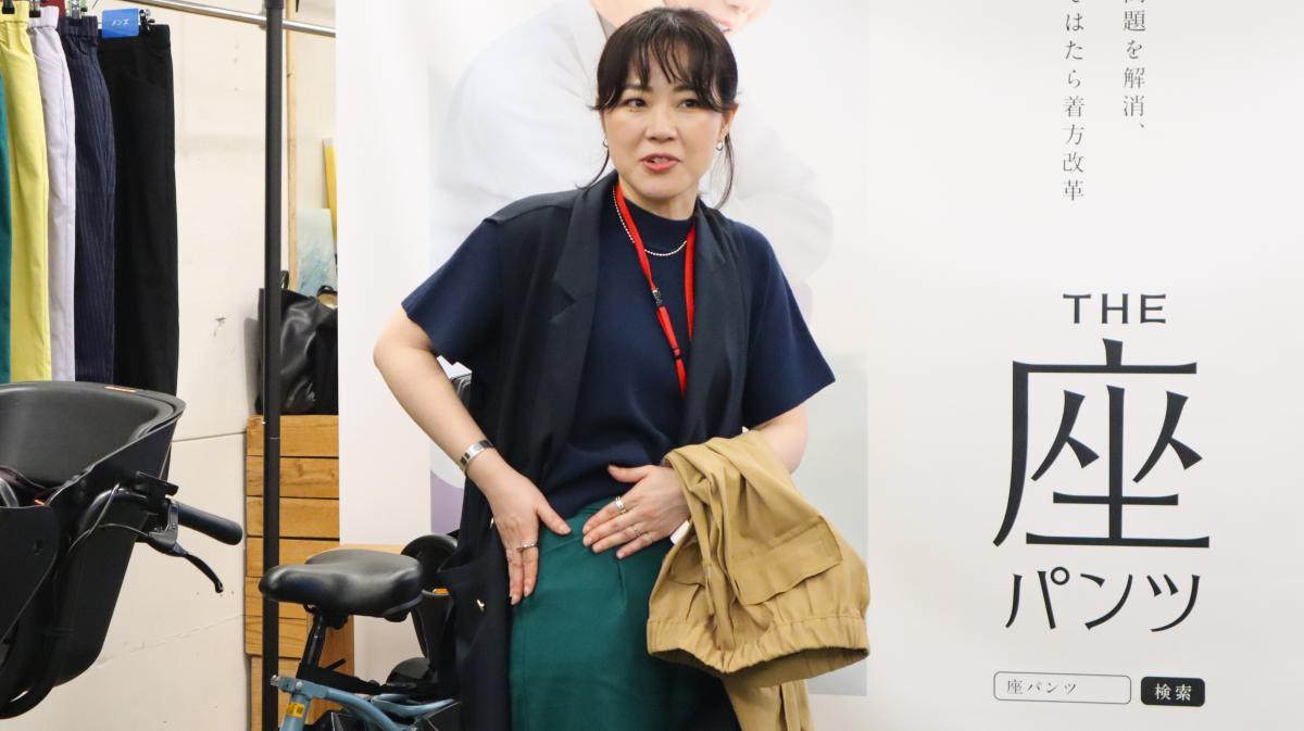 会場内に並んでいるのは、「座(THE)パンツ」(テーパードシルエット)のブラックとベージュ、「座(THE)ワイドパンツ」のグリーンとブラック。