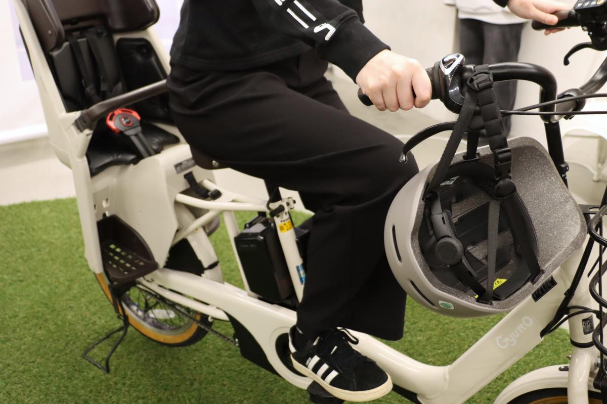 試着後、自転車に跨ってリアルな履き心地を体験できるブースも登場。
