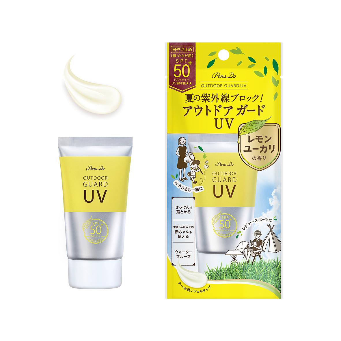 「パラドゥ アウトドア ガードUV」は、日やけ防止効果が最高値のSPF50+・PA++++・UV耐水性★★。蒸し暑い時季でもさわやかなレモンユーカリのほのかな香りで、日やけ止め特有のニオイが気になりません。