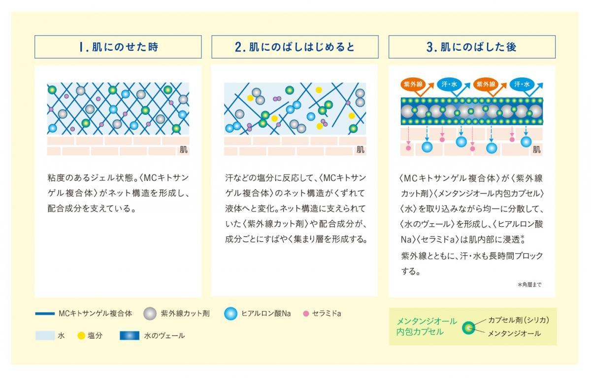 肌表面の汗などの塩分に触れると「MCキトサンゲル複合体」がくずれ、水分や油分に負けない"水のヴェール"に変わります。保湿成分「MCキトサン」が角層に吸着し、うるおいを保ちます。紫外線に加え汗や水も長時間ブロック可能で、アルカリ性成分に触れると液状になって流れるため、石けんなどで簡単にオフできます。