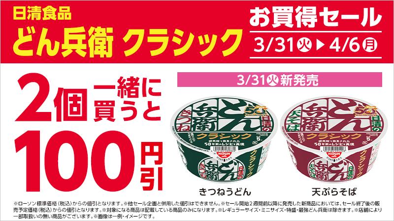 3月31日に発売した日清食品「どん兵衛 クラシック」を2個一緒に購入すると、100円引きで購入できます。