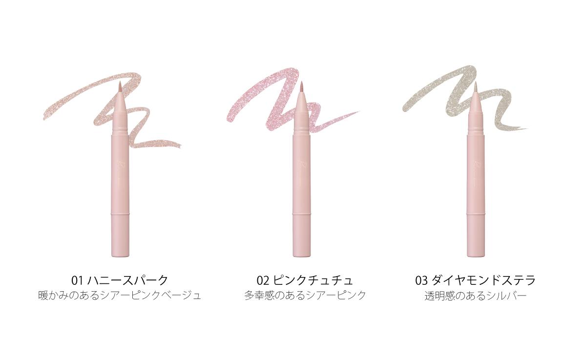 温かみのあるシアーピンクベージュ「01 ハニースパーク」、多幸感のあるシアーピンク「02 ピンクチュチュ」、透明感のあるシルバー「03 ダイヤモンドステラ」の全3種。