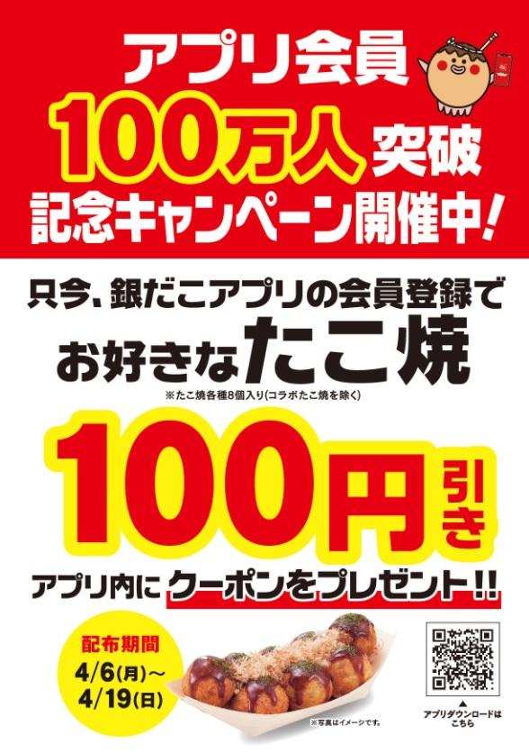 今回アプリ会員が100万人を突破したことを記念して、4月6日から19日までの期間中に銀だこアプリをダウンロード&会員登録すると「お好きなたこ焼100円引き」のクーポンがもらえます。