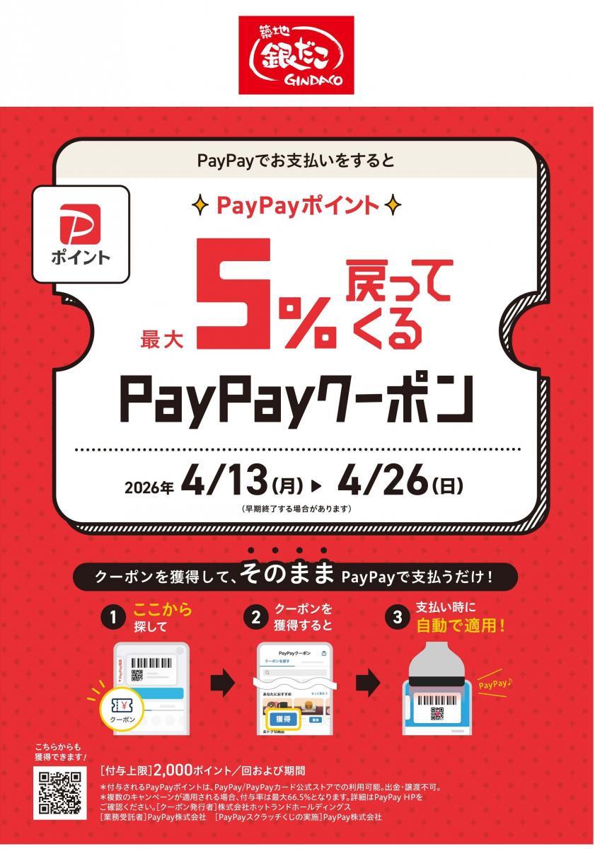 築地銀だこは、2026年4月6日から19日まで、アプリ会員100万人突破を記念した「お好きなたこ焼100円引き」のクーポンを配信中。さらに、4月13日から26日まで、会計額の最大5%がPayPayポイントとして戻ってくる「PayPayクーポン」も配布します。