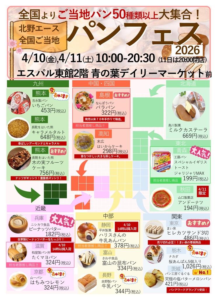 2026年4月10日と11日、エスパル仙台東館2F青の葉デイリーマーケット前特設スペース(仙台市青葉区)にて期間限定SHOP「北野エース全国ご当地パンフェス2026」が開催されます。 お店で買えない幻パンも登場 全国でみんなの暮らしを彩っている、人気ご当地パン50種類以上が大集合します!大分県での圧倒的人気を誇る、お店で買えないと幻の「三角チーズパン」(つるさき食品)や沖縄県で人気の「ゼブラパン」などが登場します。また、2日目はカレーパン祭りを開催。福神漬けカレーパンや月見カレーパンなど変わりカレーパンが目白押しで、どれを食べようか迷ってしまいそう!全て数量限定での入荷の為、売り切れ次第終了です 入場無料。開催時間は10時から20時30分(11日は20時)まで。