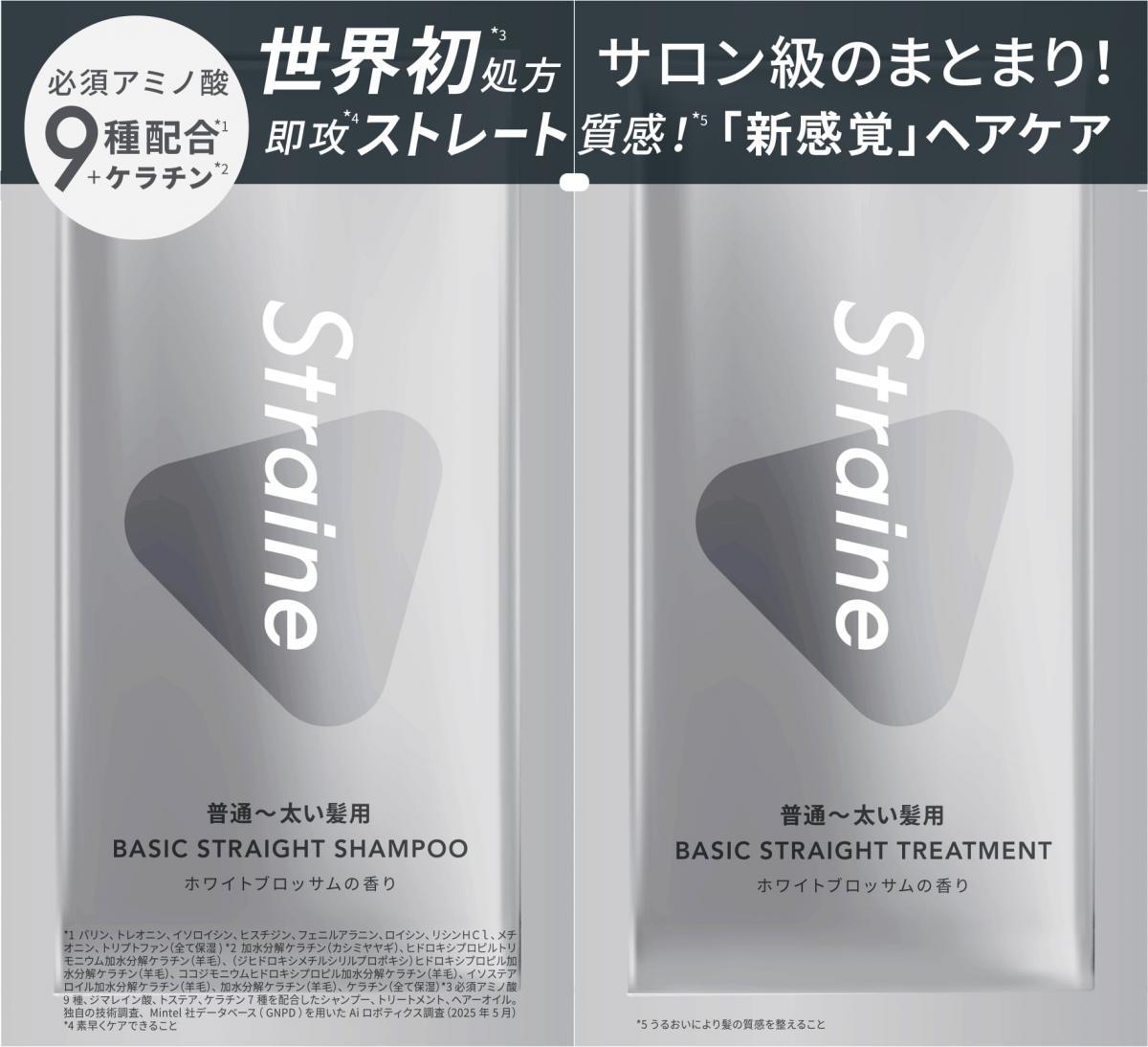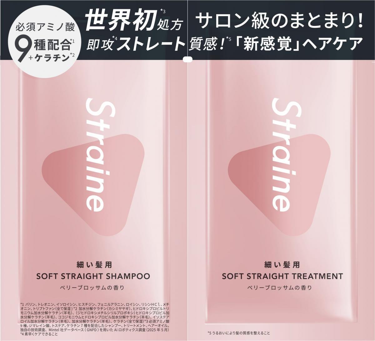「straight(真っすぐ)」と「line(線)」を掛け合わせて名付けたという「Straine」ブランド。毛髪構造を深く研究して開発した本格処方でストレートヘアケアを実現するといい、より幅広い髪の悩みに応えるため、髪の太さによって異なる内部構造に着目し、普通~太い髪用「BASIC」と細い髪用「SOFT」、2つのラインを4月1日に発売しました。