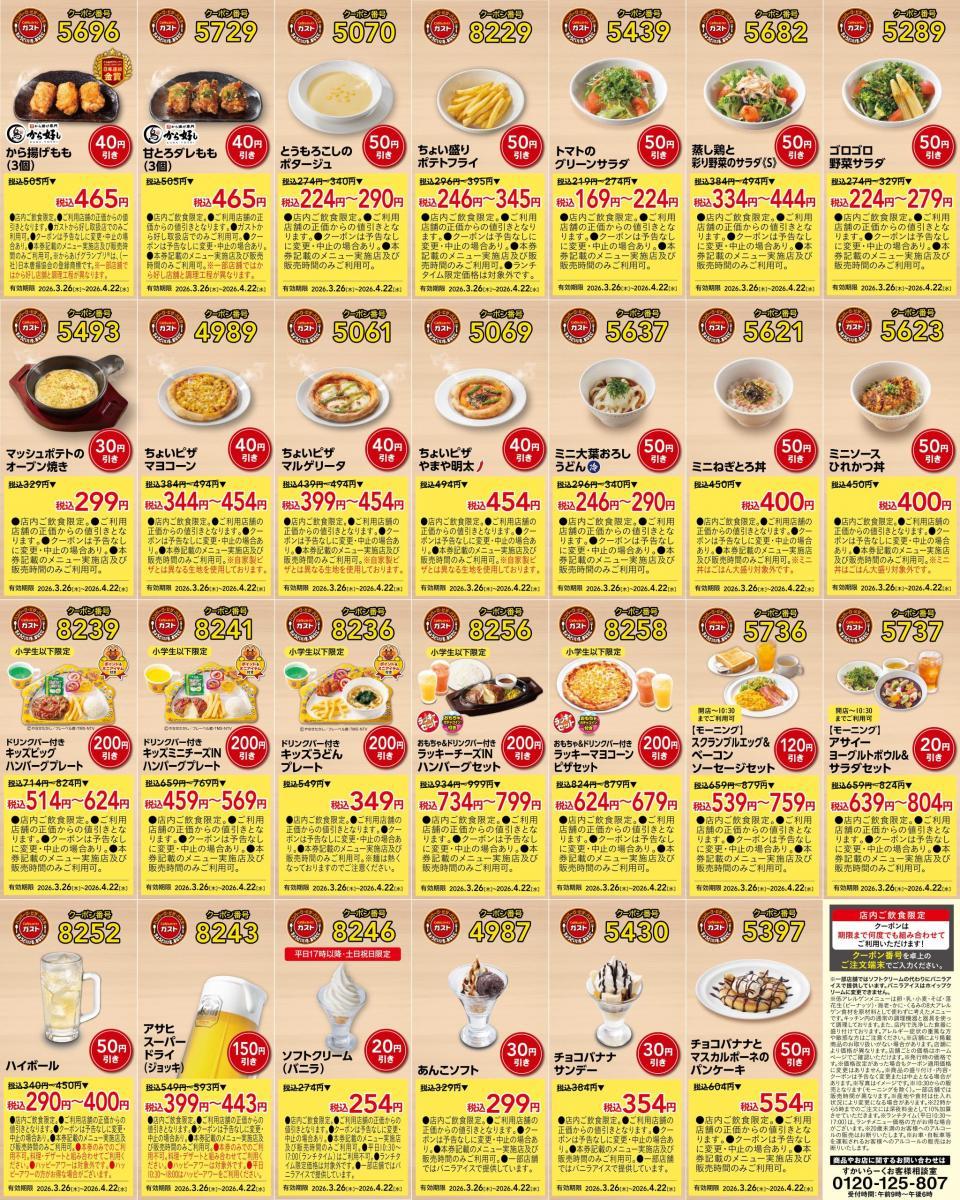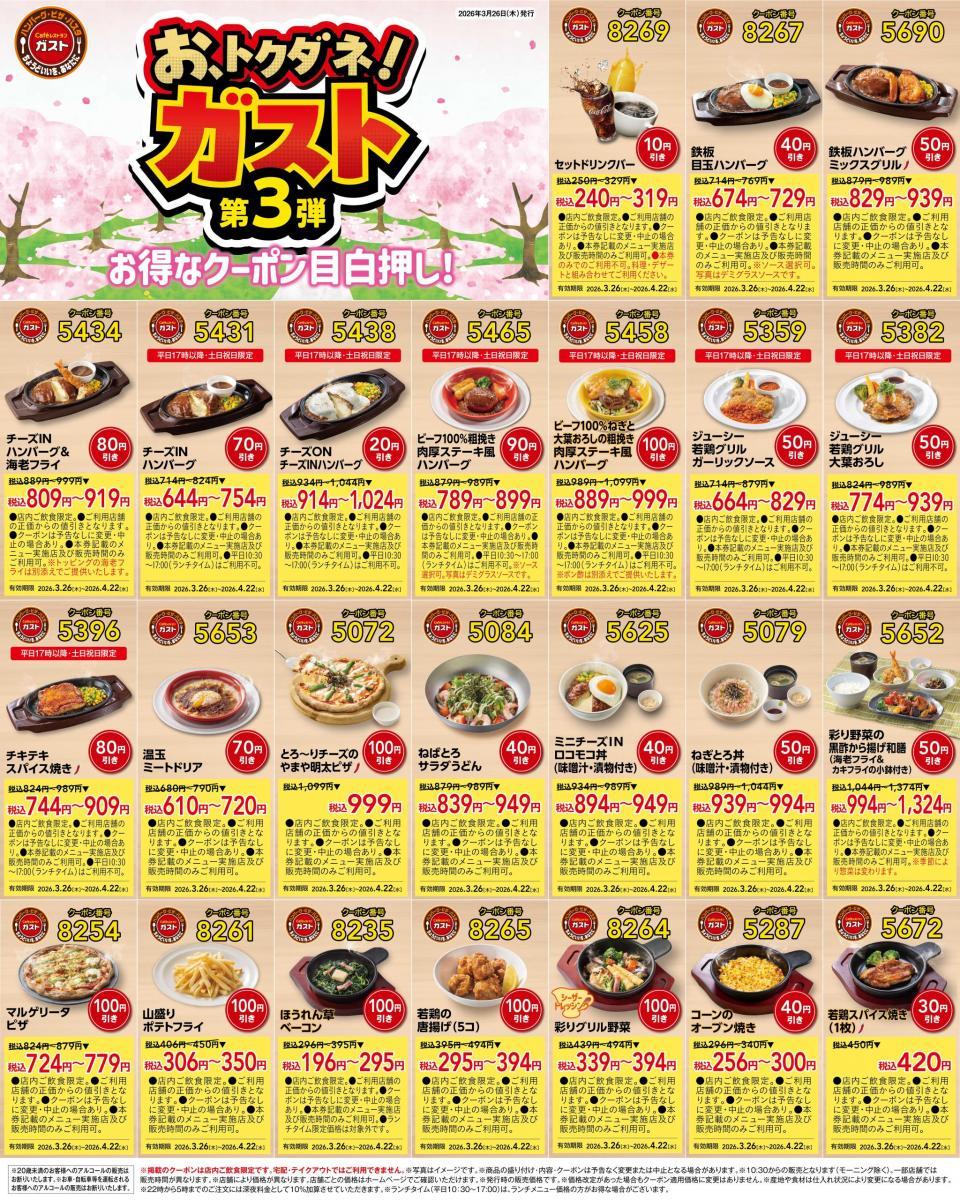 ガストの公式Xは、2026年3月26日から4月22日まで使えるクーポン51枚を公開しています。