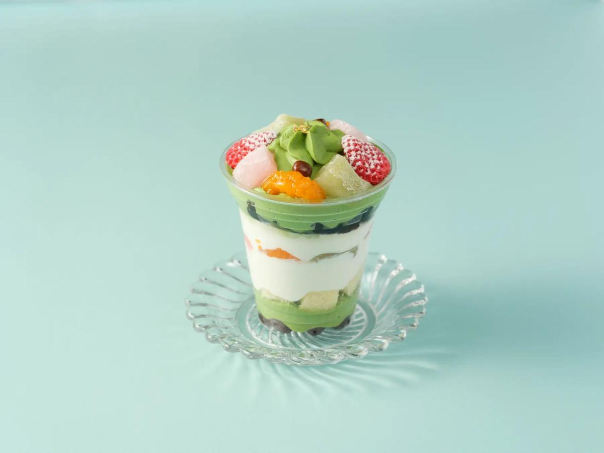 東京ギフトパレット限定かつ週末限定のパフェ。抹茶クリームをベースに、いちご、赤えんどう豆、求肥、黒蜜を合わせた、和と洋の魅力を一度に味わえるひと品です。