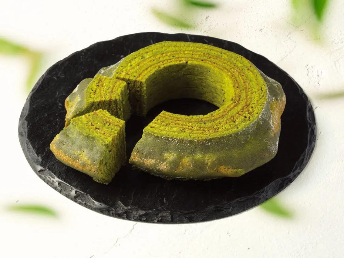 一層ずつ厚めに焼き上げた、しっかり食感のバウムクーヘン。抹茶をたっぷり使った濃厚な味わいに加え、表面の抹茶グラサージュのシャリっとした食感がアクセントになっています。