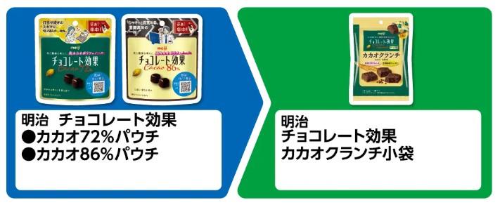 1つめの対象商品は、明治「チョコレート効果」の「カカオ72%パウチ」「カカオ86%パウチ」。