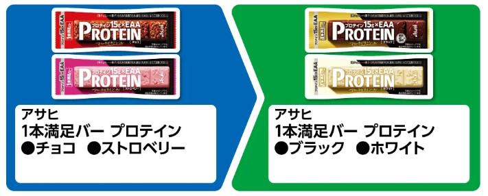 3つめの対象商品は、アサヒ「1本満足バー プロテイン」の「チョコ」「ストロベリー」。