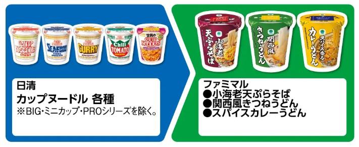 1個購入すると、ファミマル「小海老天ぷらそば」「関西風きつねうどん」「スパイスカレーうどん」のいずれか1個と引き換えられる無料券がもらえます。