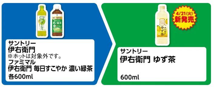 8つめの対象商品は、サントリー「伊右衛門」(ホットは対象外)とファミマル「伊右衛門 毎日すこやか 濃い緑茶」(各600ml)です。