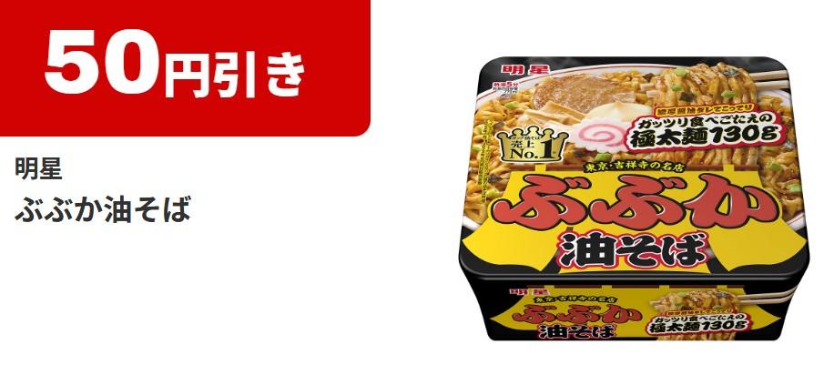 4月14日から5月11日までの期間、明星「ぶぶか油そば」に使える50円引きファミペイクーポンを配信しています。