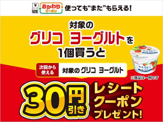 4月9日から22日までの期間、対象のグリコ ヨーグルトを購入すると、次回使える30円引きクーポンがもらえます。