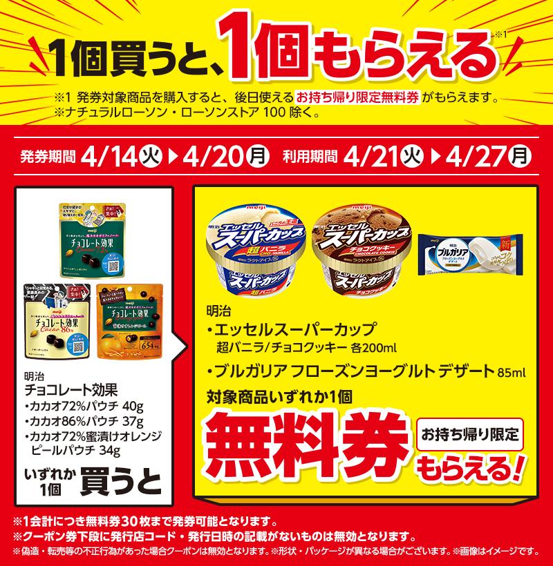 いずれか1個を購入すると、「エッセル スーパーカップ」の「超バニラ」「チョコクッキー」、「ブルガリア フローズンヨーグルトデザート」のいずれか1個と引き換えられる無料券がもらえます。