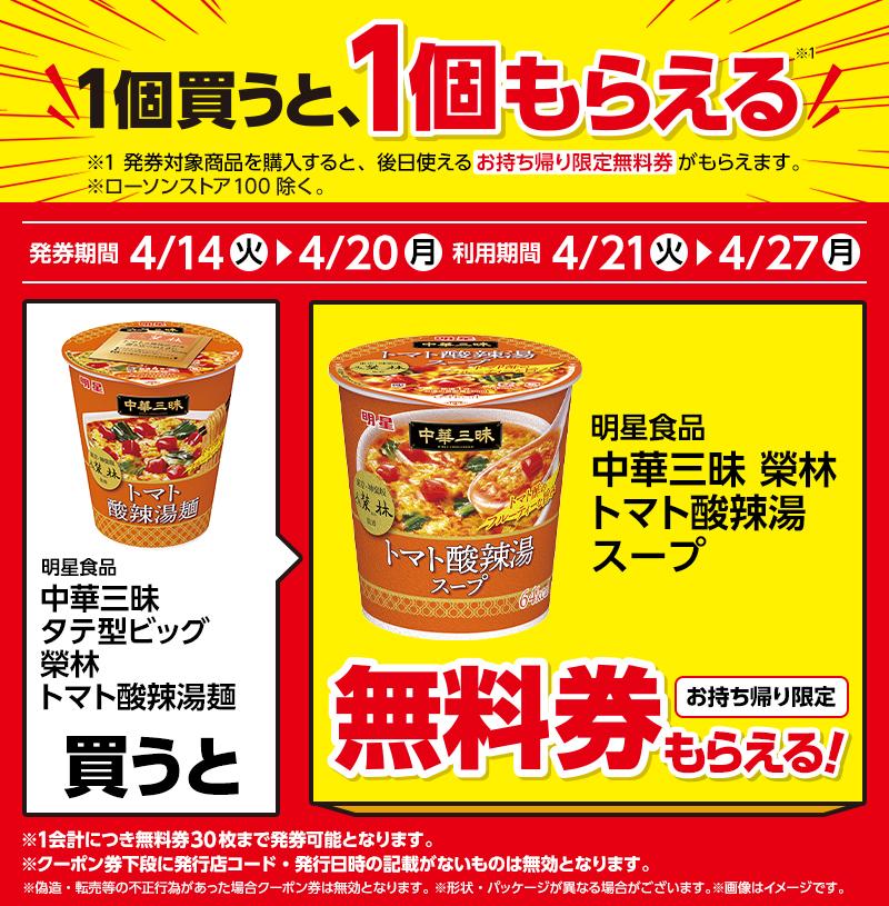 1個購入すると、「中華三昧 榮林 トマト酸辣湯スープ」1個と引き換えられる無料券がもらえます。