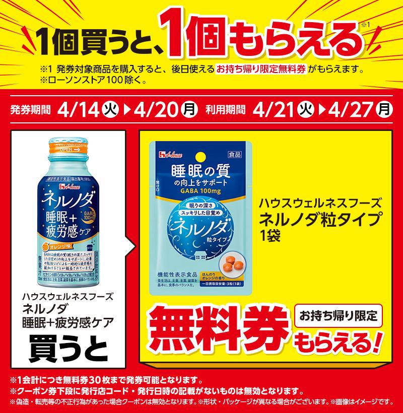 1個購入すると、「ネルノダ粒タイプ」(1袋)1個と引き換えられる無料券がもらえます。