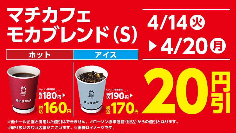 4月14日から20日までの期間、「モカブレンド(S)」と「アイスモカブレンド(S)」がそれぞれ20円引きで購入できます。